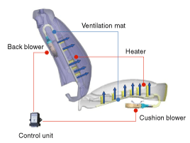 seat. A blower mounted in the seat generates the cool air, which then travels