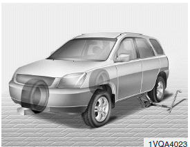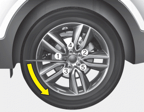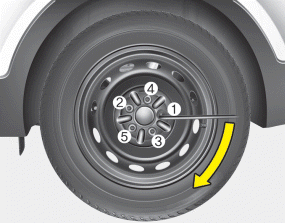 Then position the wrench as shown in the drawing and tighten the wheel nuts. Be sure the socket is seated completely over the nut. Do not stand on the wrench handle or use an extension pipe over the wrench handle. Go around the wheel tightening every other nut until they are all tight. Then double-check each nut for tightness. After changing wheels, have an authorized HYUNDAI dealer tighten the wheel nuts to their proper torque as soon as possible.