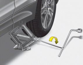 6. Loosen the wheel lug nuts counterclockwise one turn each, but do not remove any nut until the tire has been raised off the ground.