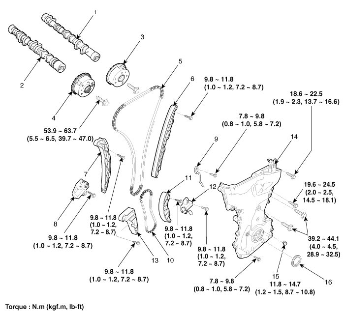 1. Intake camshaft 2. Exhaust camshaft 3. Intake CVVT assembly 4. Exhaust CVVT assembly 5. Timing chain 6. Timing chain guide |