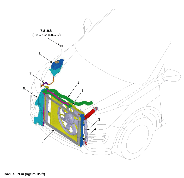 1. Cooling fan 2. Radiator upper hose 3. Radiator lower hoseRadiator cap 4. Radiator |