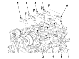 Remove the camshaft bearing cap (A) in the sequence shown.
