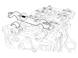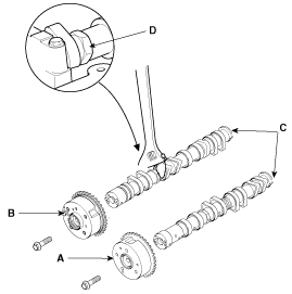 When removing the CVVT assembly bolt, prevent the camshaft from rotating by using a wrench at position D.
