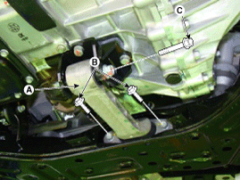 Remove the transaxle mounting bolts(A).