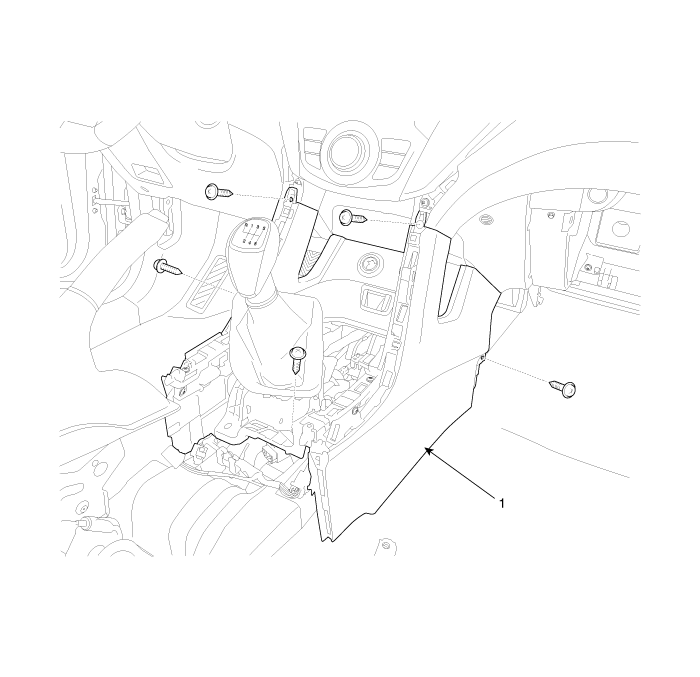 Replacement [Console rear complete assembly] [M/T] • Put on gloves to protect your hands. • When prying with a flat-tip screwdriver, wrap it with protective tape, and apply protective tape around the ...