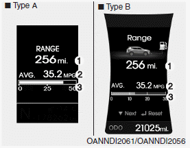 The average fuel economy is not displayed for more accurate calculation if the vehicle does not drive more than 10 seconds or 0.03 miles (50 meters) since the ignition switch or Engine Start/Stop button is turned to ON.