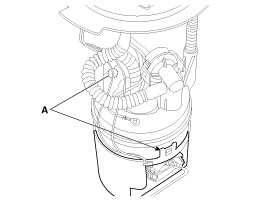 Inspection [Fuel pump motor] 1. Turn the ignition switch OFF, and then remove battery (-) cable. 2. Remove the fuel pump assembly. 3. Check motor operation by fuel pump connector (A) connecting power (No.4) ...