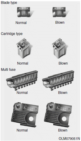 Three kinds of fuses are used: blade type for lower amperage rating, cartridge type, and multi fuse for higher amperage ratings.
