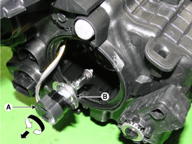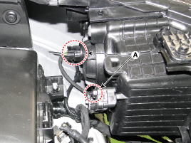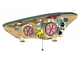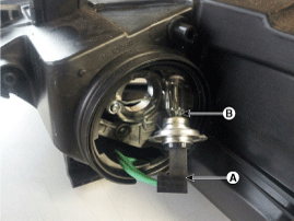 Remove the head lamp low beam bulb (B) after disconnecting the connector (A) from the bulb.