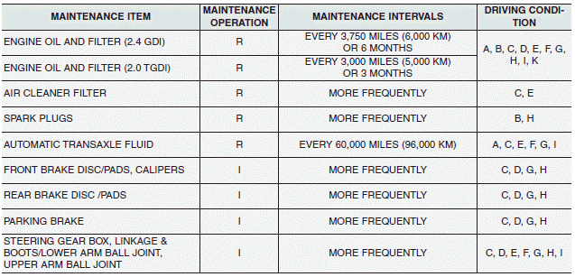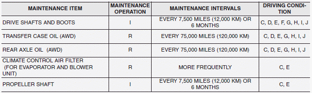 The following items must be serviced more frequently on cars normally used under severe driving conditions. Refer to the chart below for the appropriate maintenance intervals.