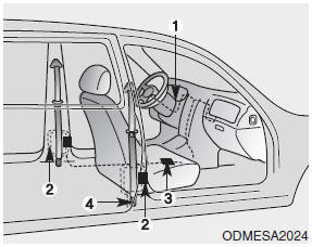 The seat belt pre-tensioner system consists mainly of the following components. Their locations are shown in the illustration: