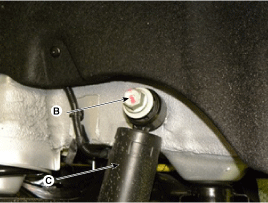 Remove the rear strut assembly (C) after loosen the bolt (B) and