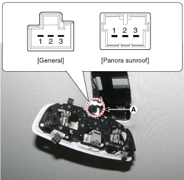 Inspection 1. Remove the overhead console lamp assembly then check for continuity between terminals. If the continuity is not as specified, replace the map lamp switch. [General] [Panorama Sunroof] Removal ...