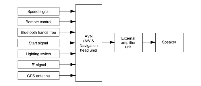 Components Location 1. AVN (A/V & Navigation head unit) 2. Tweeter speaker 3. External amplifier 4. Roof antenna (GPS) 5. Front door speaker 6. Rear door speaker 7. Subwoofer speaker 8. Antenna feeder ...