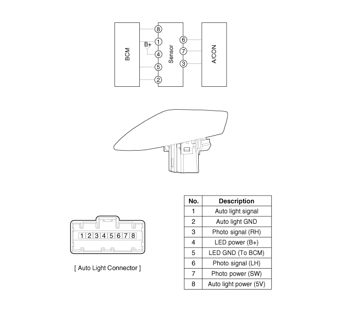 Component Location 1. Auto light sensor 2. Head lamps 3. Lighting switch (Auto) 4. Tail lamps 5. BCM (Body Control Module) ...
