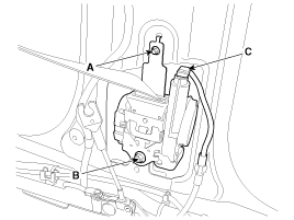 Loosen the seat belt pretensioner mounting bolts (A,B) and remove