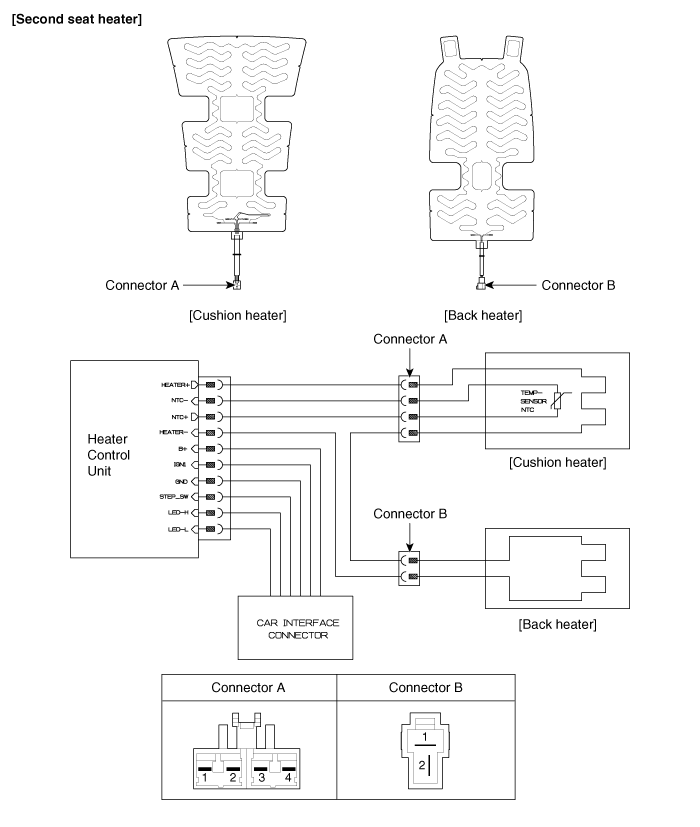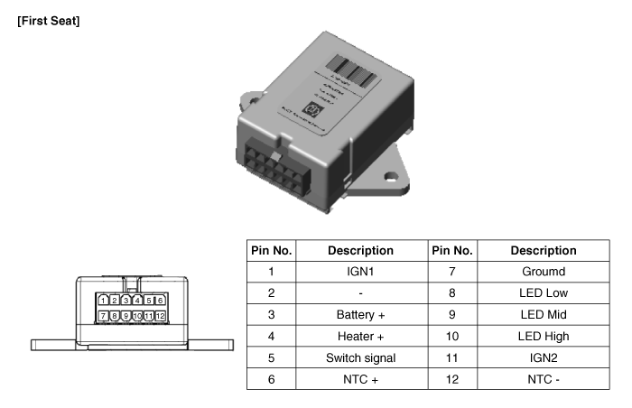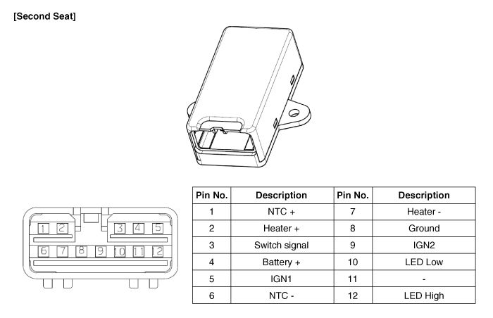 Inspection Front Seat 1. Check for continuity and measure the resistance between terminals. No. Description No. Description 1 Heater cushion + 4 Heater back + 2 NTC + 5 - 3 Ground 6 NTC - Standard value ...