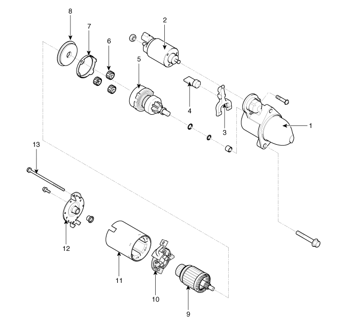 8. Shield 9. Amature assembly 10. Brush holder assembly 11. Yoke assembly 12. Rear housing 13. Through bolt |