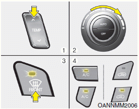 1. Select desired temperature. 2. Select desired fan speed. 3. Press the defrost button (). 4. The outside (fresh) air position will be selected automatically. If the outside (fresh) air position is not ...