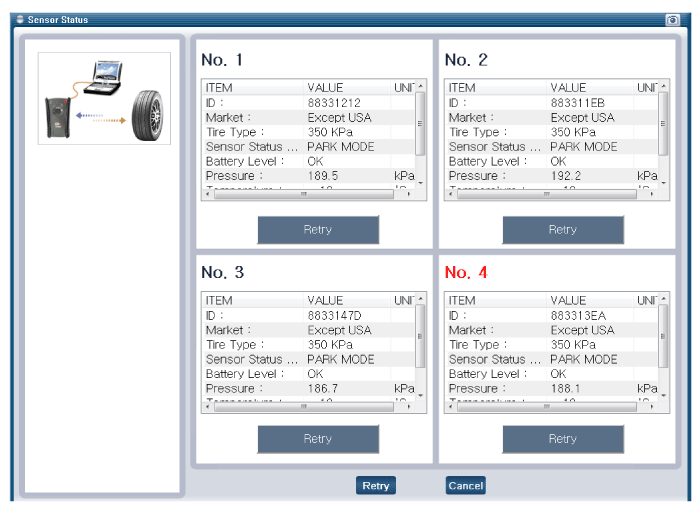 Description It search automatically sensor location and learn the new sensor. To check defect of system or vehicle, use the sensor information, distance, indistinct noise, automatic learning status, vehicle ...