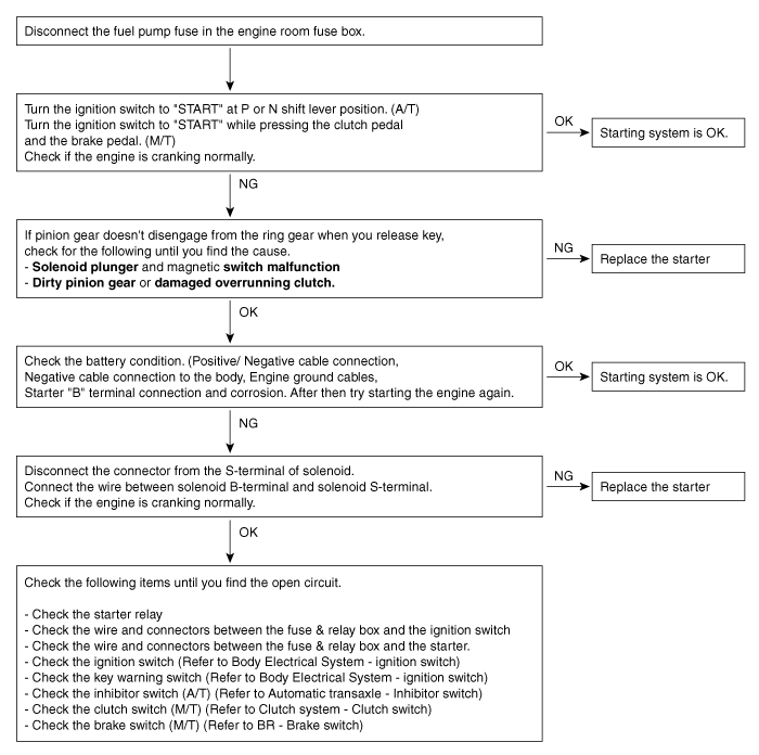 Description The starting system includes the battery, starter, solenoid switch, ignition switch, inhibitor switch (A/T), clutch pedal switch (M/T), ignition lock switch, connection wires and the battery ...