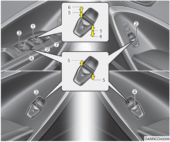 - Never try to operate the main switch on the driver's door and the individual door window switch in opposing directions at the same time. If this is done, the window will stop and cannot be opened or closed.